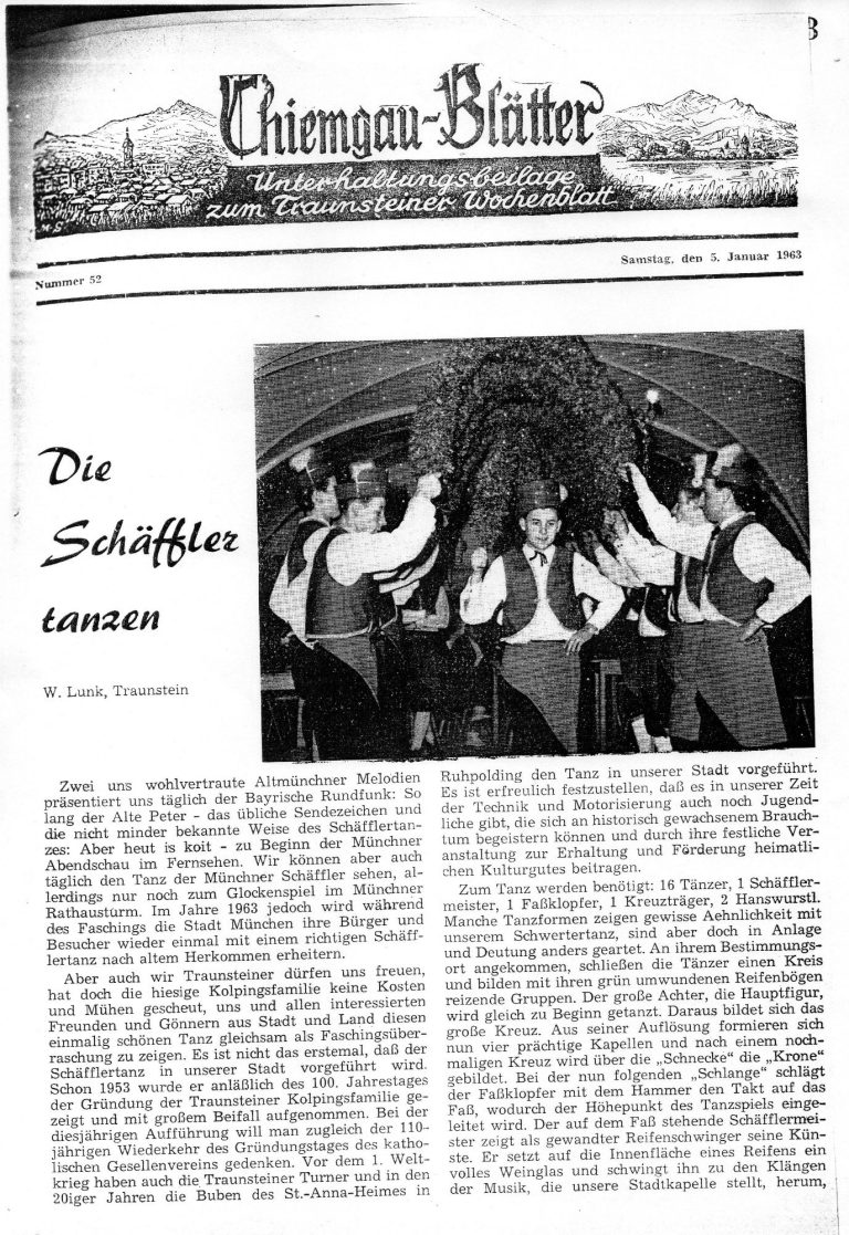 Der Traunsteiner Schäfflertanz wurde erstmals 1865 erwähnt. 1914 wurde der Zunfttanz vom Turnverein Traunstein gestaltet. Anlässlich ihres 100-jährigen Bestehens führte die Kolpingfamilie Traunstein im Jahr 1953 den Schäfflertanz erstmals auf. Seitdem hat sich dieser Brauch in unserer Stadt als kulturelle Veranstaltung etabliert und wurde bis 2013 im außergewöhnlichen 10-Jahres-Rhythmus während der Faschingszeit aufgeführt. In Anlehnung an andere Schäfflertanzgruppen wurde 2014 beschlossen, den Tanz künftig auch alle sieben Jahre aufzuführen. Der nächste Schäfflertanz der Kolpingfamilie Traunstein fand somit im Jahr 2020 statt. Zusätzlich wurde der Tanz anlässlich der 125-Jahr-Feier der Kolpingfamilie Traunstein im Jahr 1978 aufgeführt. Im April 2022 nutzten die Traunsteiner Schäffler das Ende des Corona-Lockdowns, um die Tradition des Schäfflertanzes aufleben zu lassen – angelehnt an die Pestepidemien. Zu diesem Zweck fand am Traunsteiner Stadtplatz die einmalige gemeinsame Veranstaltung „Kemma wieder zam” statt.